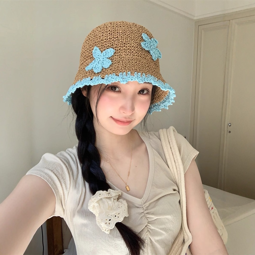 色とりどりの夏 ~ 新型草編みの花は日よけの麦わら帽子の女性の日本系の甘いファッションの顔の小さい漁師の帽子を遊びに行きます。