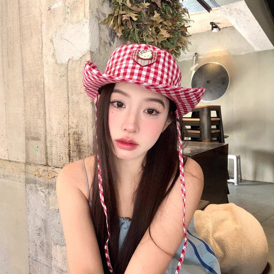 格子縞カジュアルな日焼け止め漁師帽の子供は甘くてかわいいkt猫の大きな帽子のつばに盆帽の頭の周りがついている