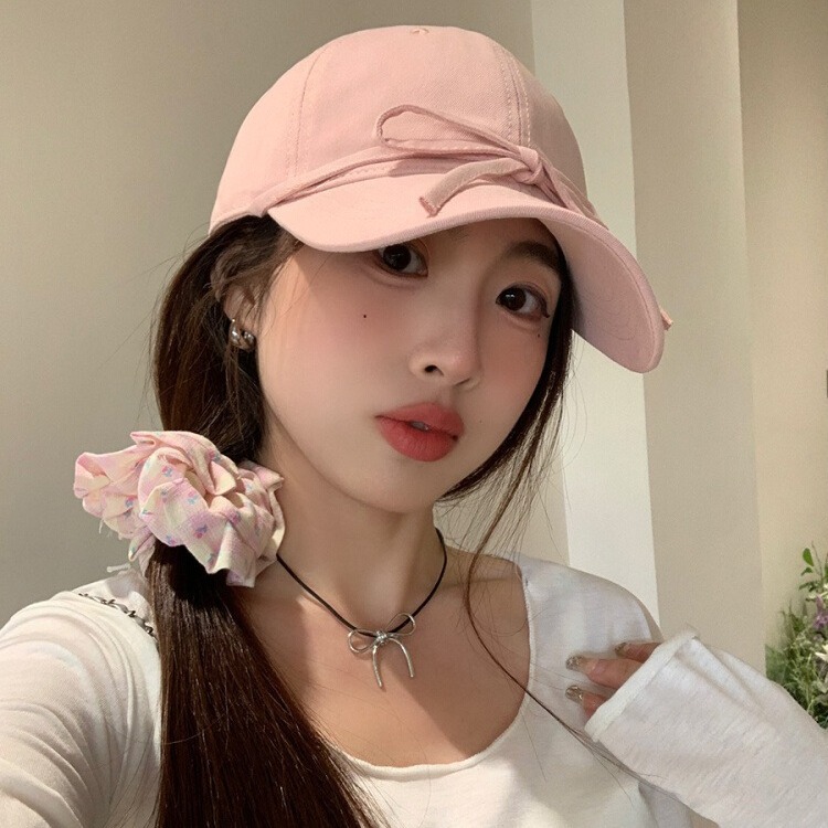 オタクの女性はピンクの蝶結びのアヒルの舌の帽子の子供を結びます。