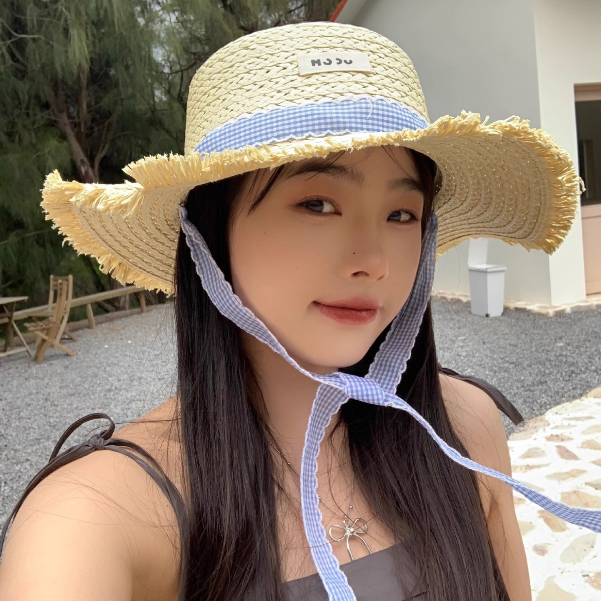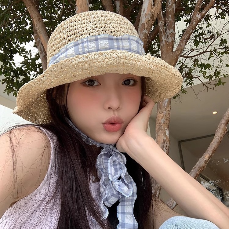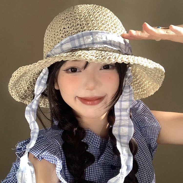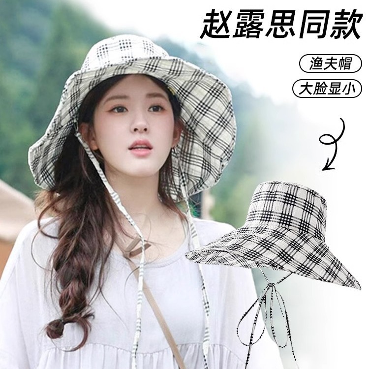 趙露思同金日焼け止め帽子女夏2024新紫外線防止日除け帽子格子顔小漁師帽