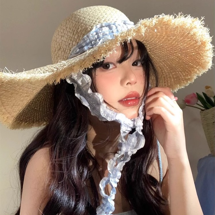 日本の小清新な青い格子編みリボンの麦わら帽子の女性の夏の旅行の大きいつばの日焼け止めの日よけのビーチの帽子の潮