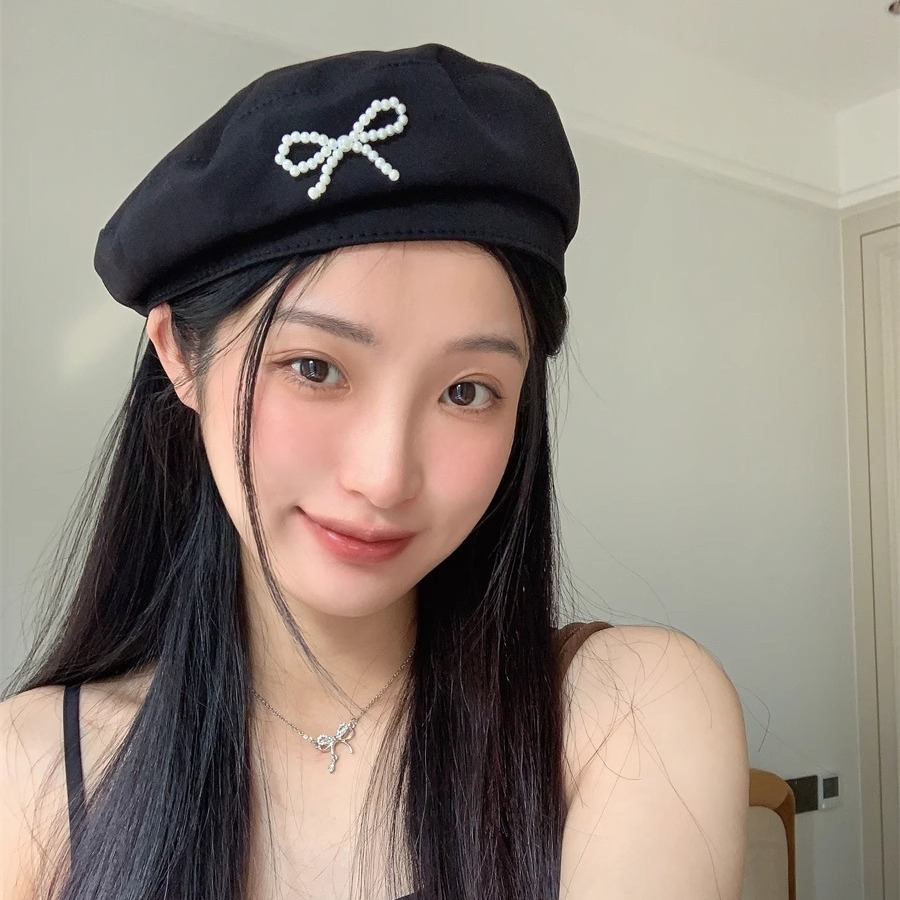 おしゃれなつまみ ~ 蝶結び真珠黒ベレー帽女性韓系ins夏の薄い通気性の甘い画家帽