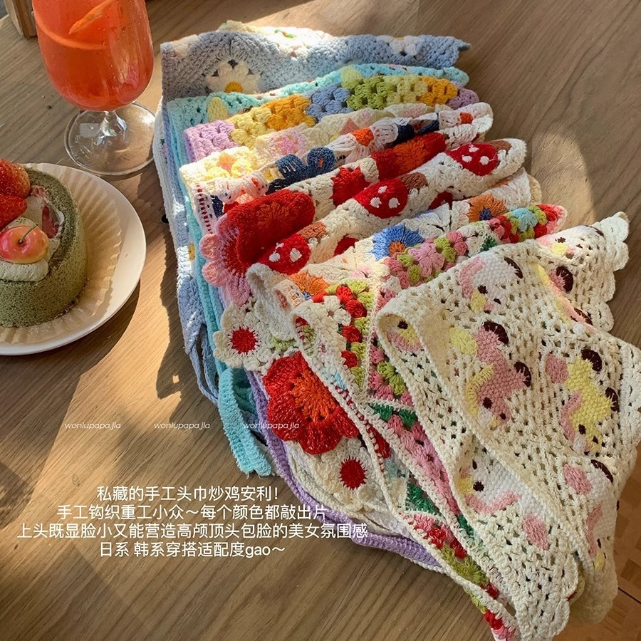 かわいい青いデイジー三角スカーフの女性の夏の髪は森系田園風の写真を撮ってネットレッドと同じ頭飾りを持っている