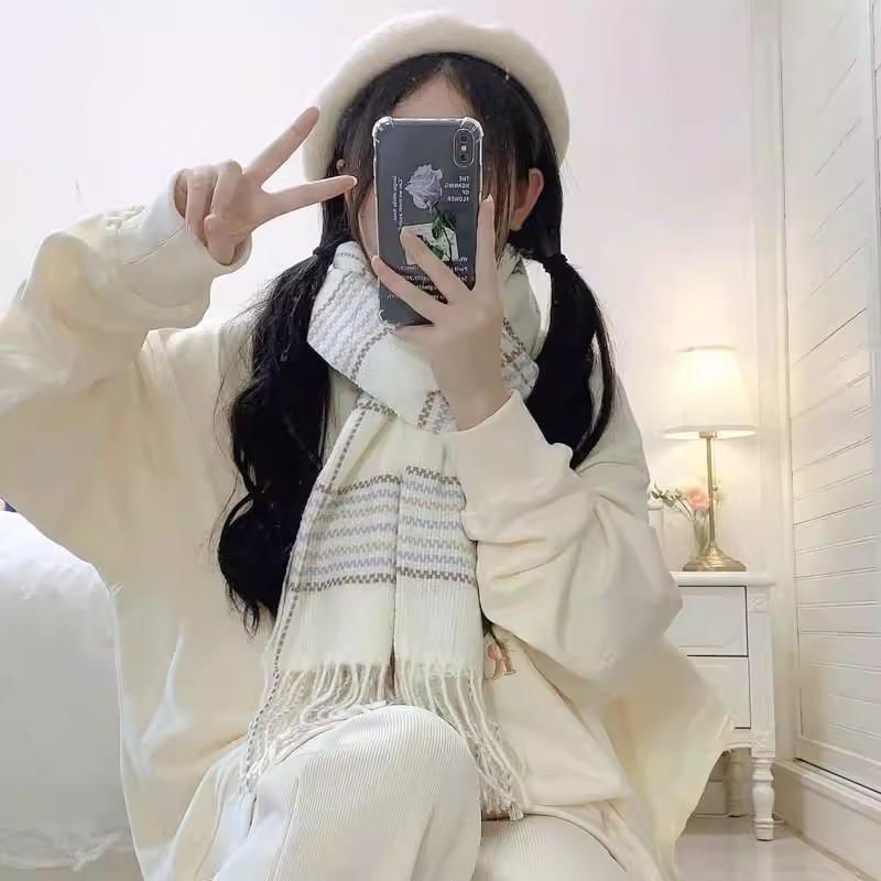 2023新作の白いマフラーの女性の冬の韓国系の雰囲気感の格子のフリンジはカシミヤの保温のマフラーの秋をまねます。