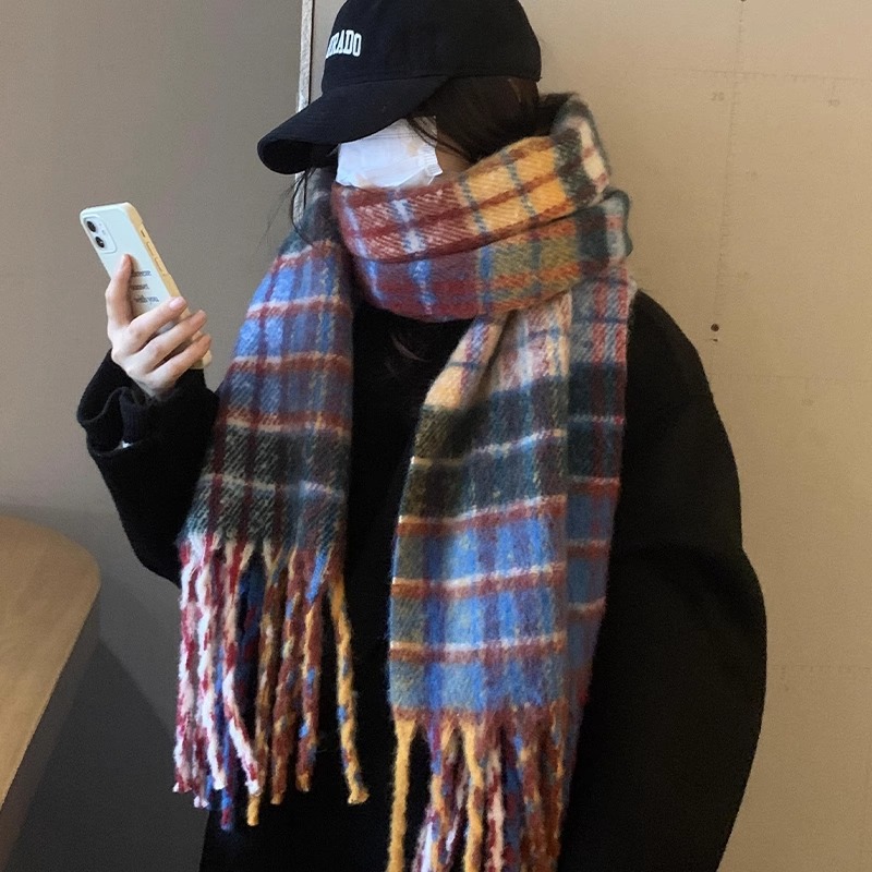高品質雰囲気感マフラー女性冬日韓ソフトモチモチ流蘇衝突色格子ストールネット赤保温マフラー男