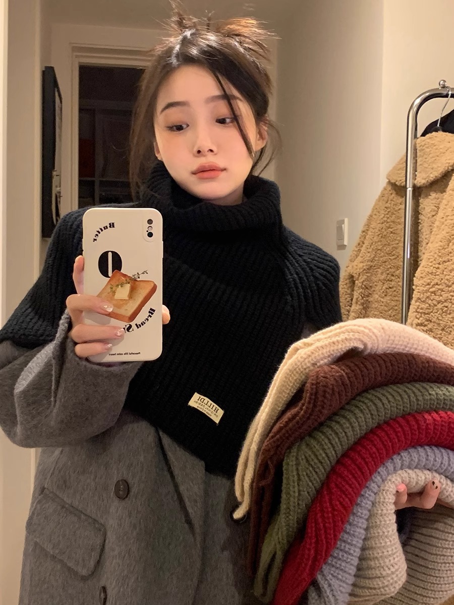 おしゃれなフォークの高襟のストールの女性は秋冬の黒い首のカバーのニットのマフラーを着て防寒します。