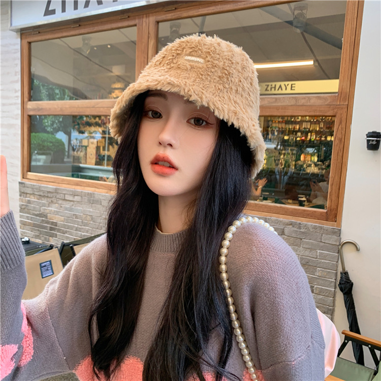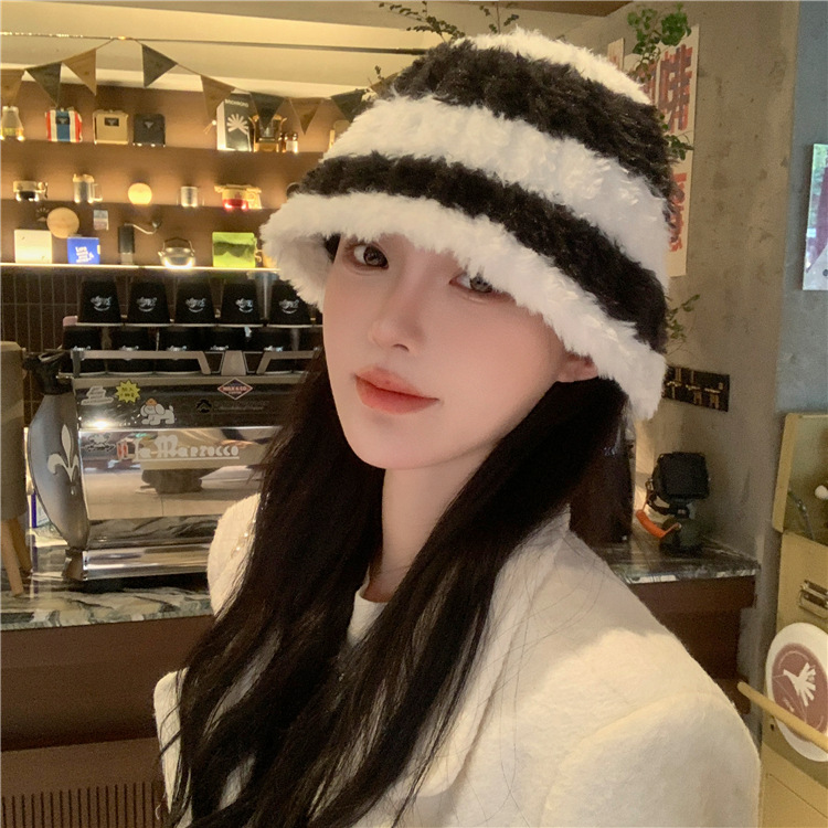 ネットの赤いストライプの羊の小毛の漁夫の帽子の女性の韓国版のぬいぐるみのバケツの帽子の女性の秋冬のすっぴんは顔の大きい頭を覆います鉢の帽子