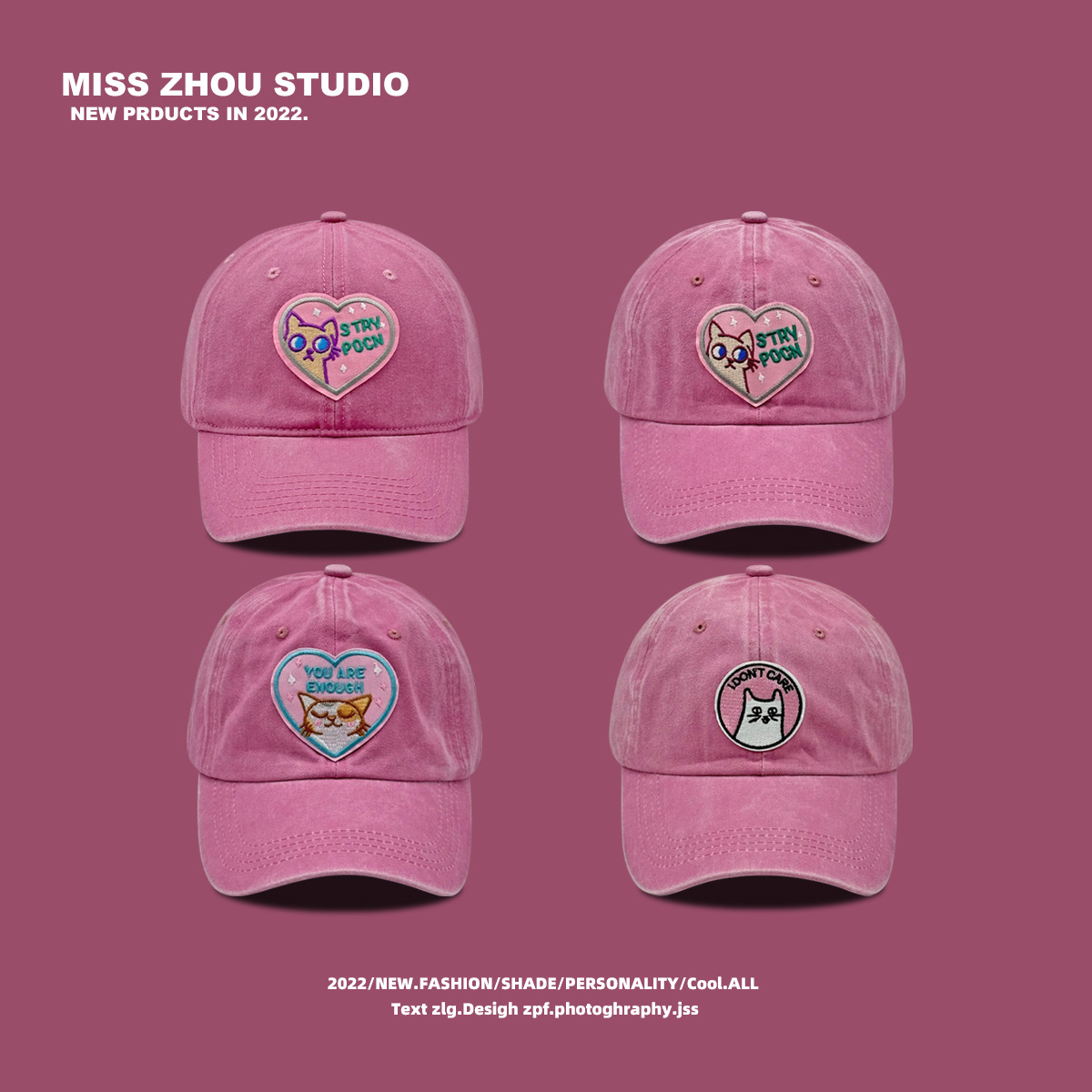 韓国insピンクの少女猫刺繍かわいい野球帽の子供が水洗いして古いソフトトップのアヒルの舌帽の学生を作る