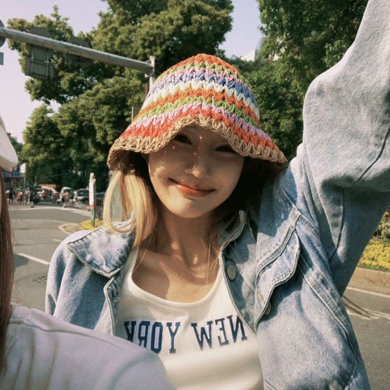 麦わら帽子の女性は、ボヘミアンの海辺の虹の色合わせの漁師帽を折って、太陽を遮って顔を見せます。