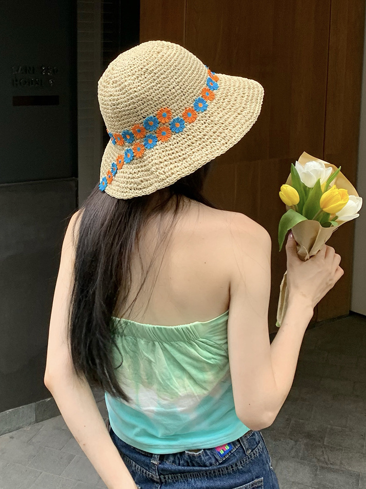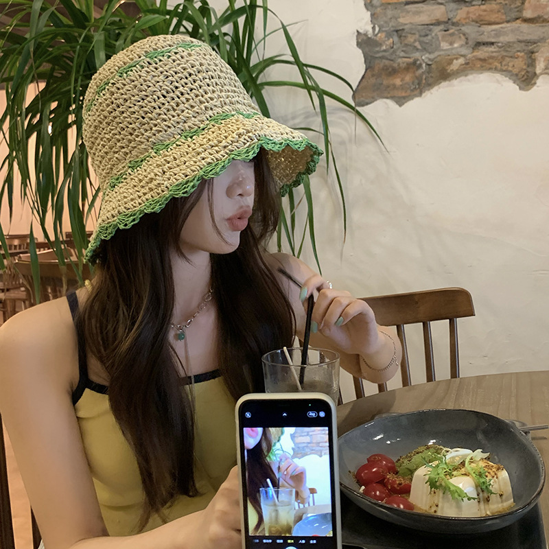 独特のかわいい2色のつなぎ草編み漁師帽女性夏日よけ帽子日焼け止め高級感ネットレッドins潮