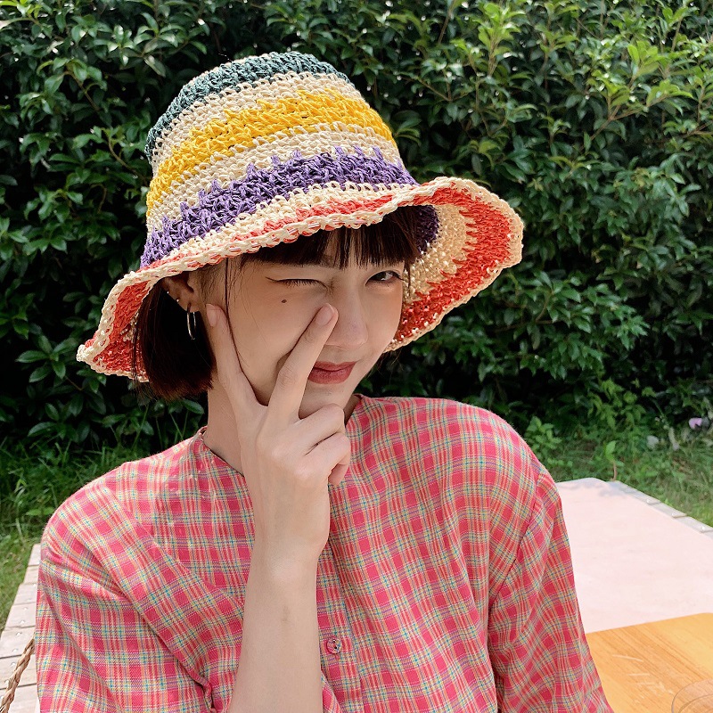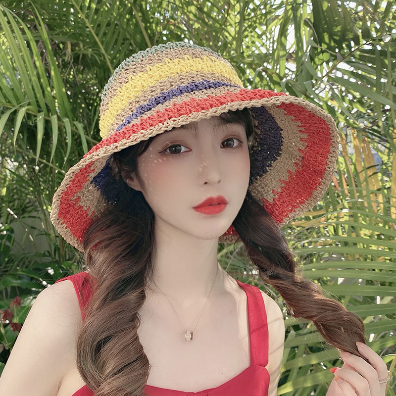 カラーストライプの美しい風の麦わら帽子の女性の夏の韓国版の透かし彫りの折り畳みの漁師の帽子のビーチの日よけの日の帽子の潮