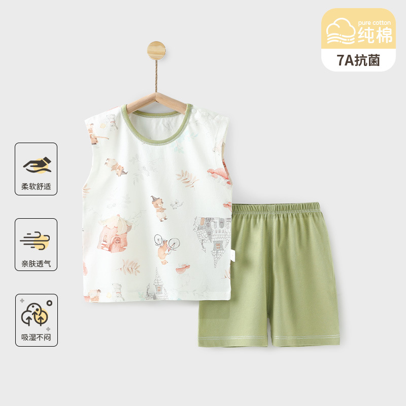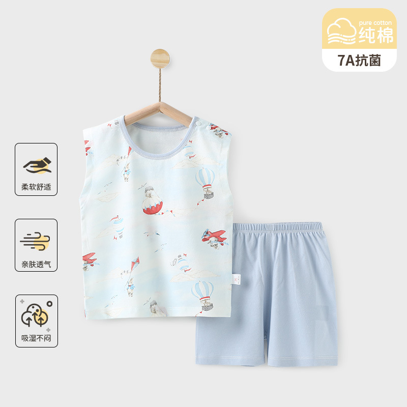 赤ちゃんの純綿ベストセット夏の薄いタイプの赤ちゃん服の袖なしのお腹保護パンツの家庭服の抗菌パジャマ