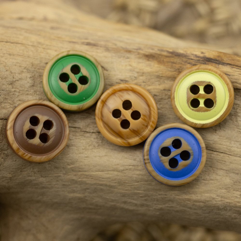 黄褐色の木目の復古は古い綿麻のシャツの樹脂のボタンの緑色の青いコーヒーの色のpolottのシャツのボタンをします。
