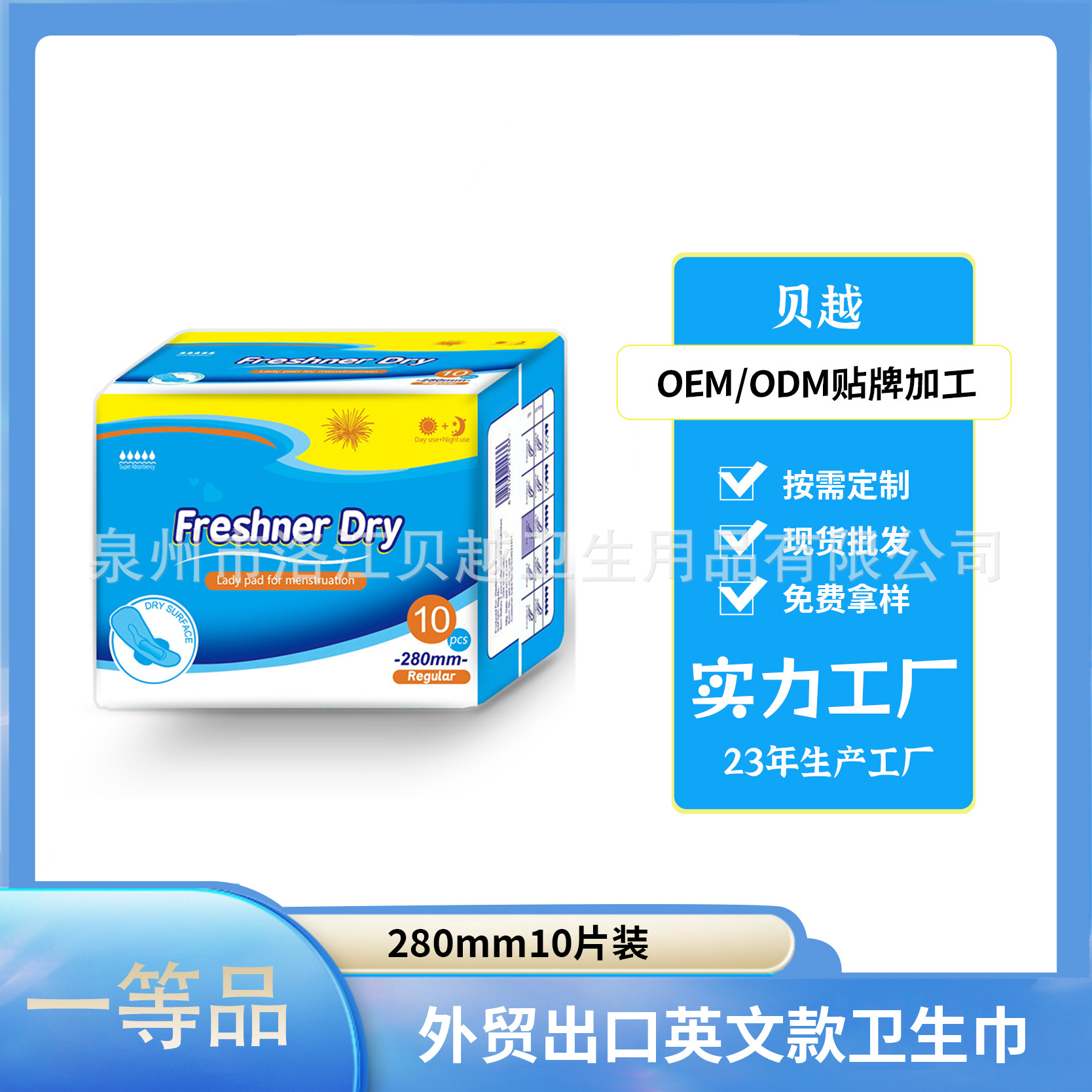 泉州メーカー 外国貿易輸出 アフリカ 南米 東南アジア 生理用ナプキン 女性用 10枚入 280mm 完全英語