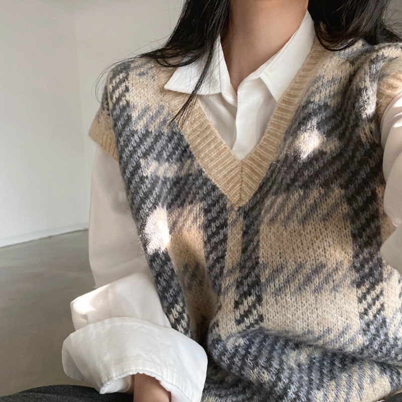 レトロなvネックの格子のニットのベストの女性の秋冬のゆったりしている外は重ねて小さい清新なセーターのベストの2023新型を着ます。