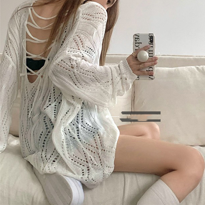 白いニットブラウスの女性の春のストラップの外に2023の新しいデザイン感があります。