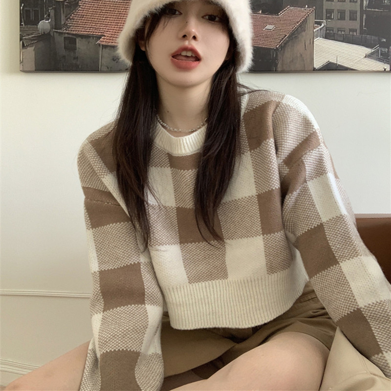 秋冬2023新作の格子の短いセーターの女性の甘いニットのデザイン感が小さいです。