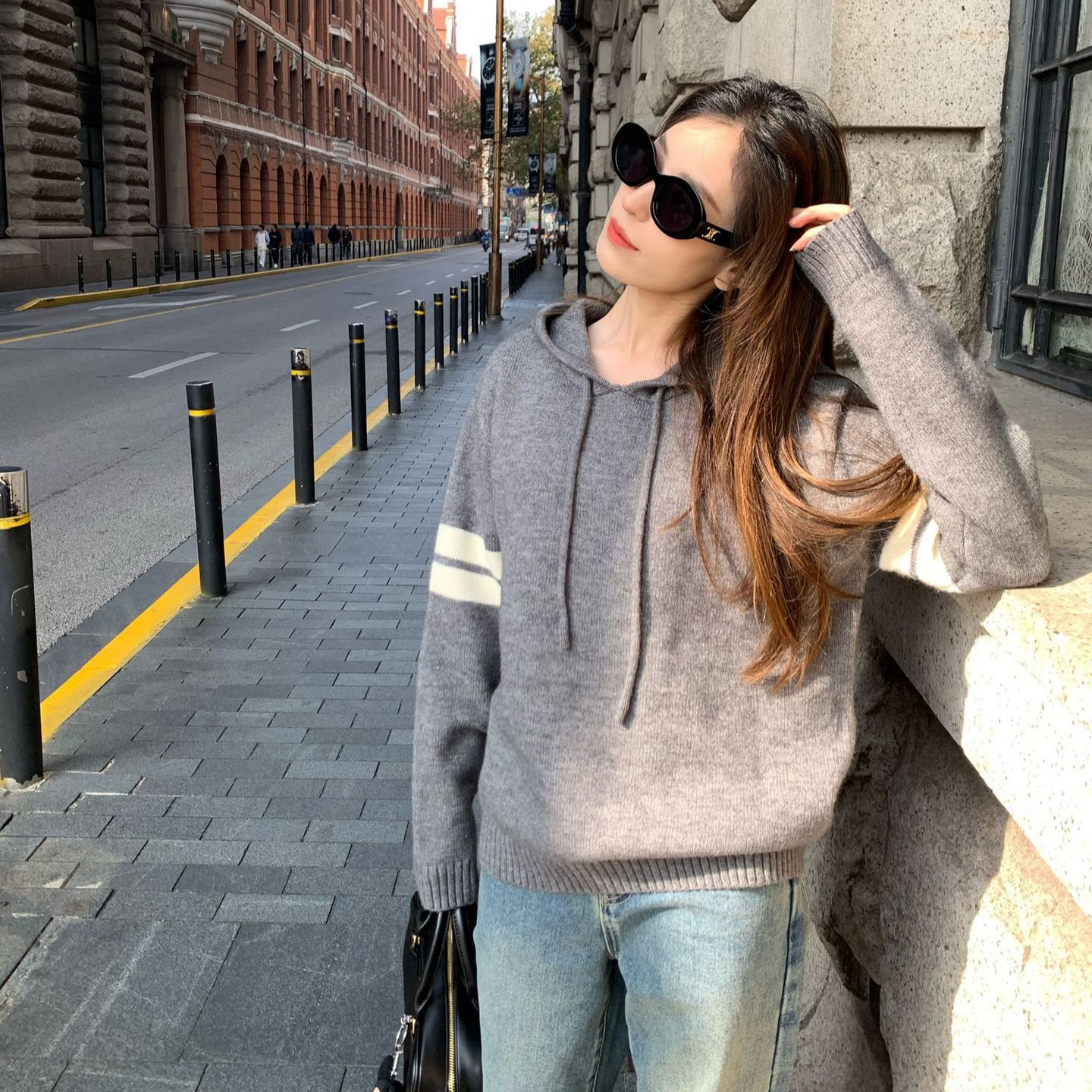 韓国系秋冬の新型の衝突色のストライプのセーターのコートの女性の怠惰な風は帽子の長袖のニットの外で上着を着ます。
