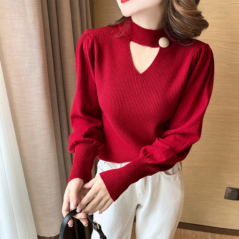 純色の半襟の小さい心機の透かし彫りのニットの底のシャツの女性の秋の新型のセクシーな中はプルオーバーのセーターの女性を掛けます。
