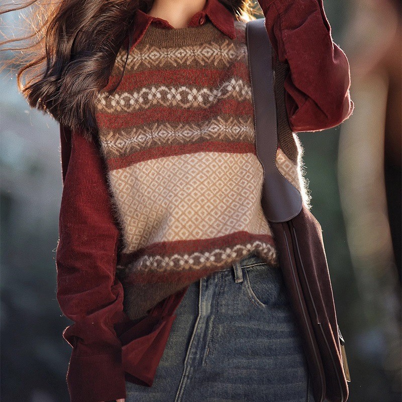 2024春秋の新型香港風の色合わせのセーターのベストの丸首は頭をかぶせてカジュアルな復古の文芸のメリヤスの女性をかぶせます。