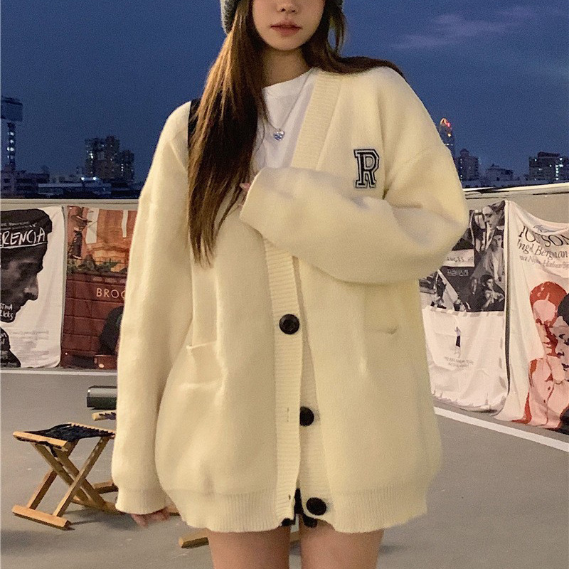 2024秋冬新型ゆるいニットカーディガン女装アルファベット刺繍上着長袖セーターコートニット女性