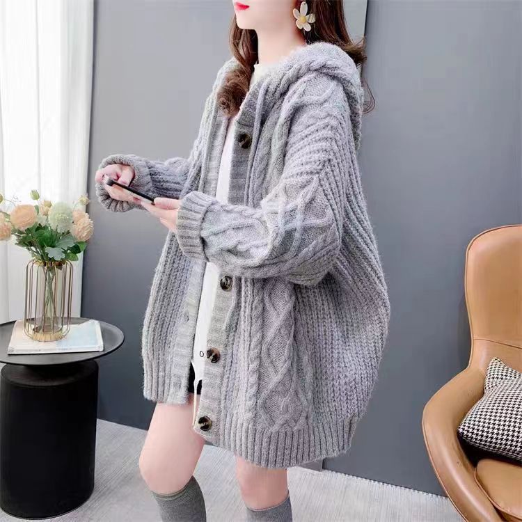 怠惰な風の復古的な厚手のフード付きセーターのカーディガン女性秋冬2024年の新型のゆったりした中長のニットコート