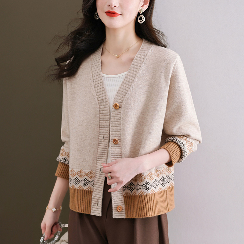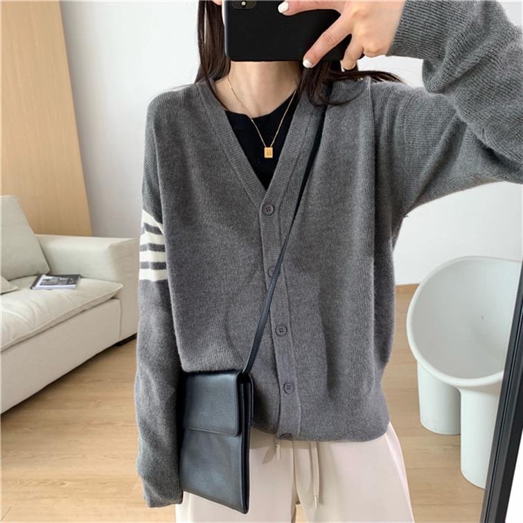 新型女装減齢学院風vネック衝突色ゆるいニットカーディガン