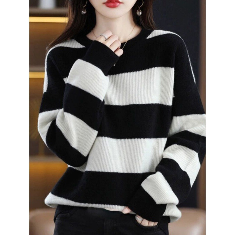白黒のストライプのニットの長袖の中で女性の2024秋冬の新型のゆったりしている外はファッションの丸首のプルオーバーのセーターを着ます。