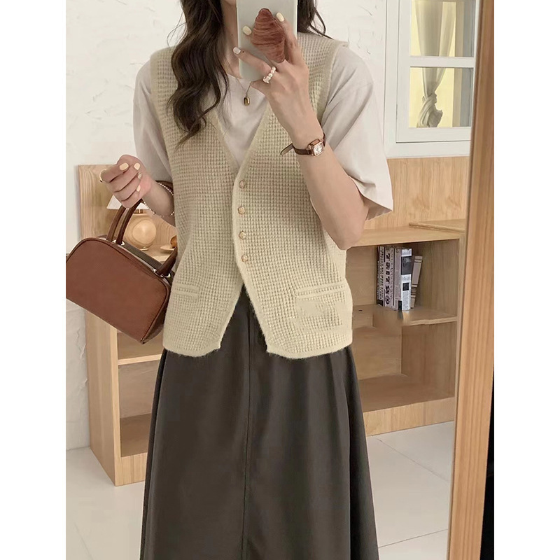 韓国系ニットベスト女性春秋2024新型フレンチレトロvネック気質ノースリーブベスト上着