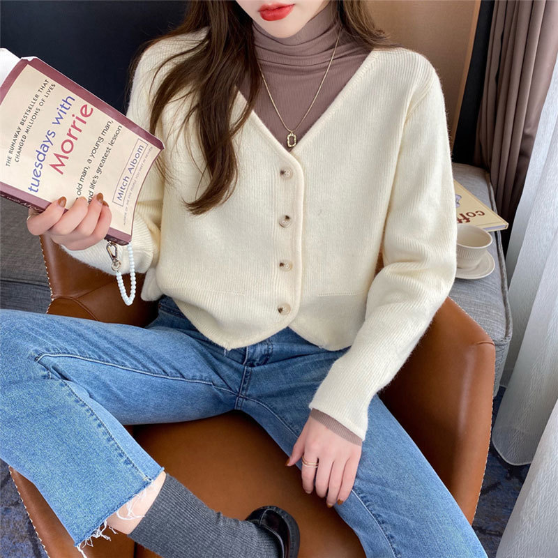 韓国系の単列ボタンのシンプルな風のニットの上着の春の新型のゆったりした柔らかいモチの丸首の百合の小さい衆のセーターのカーディガン