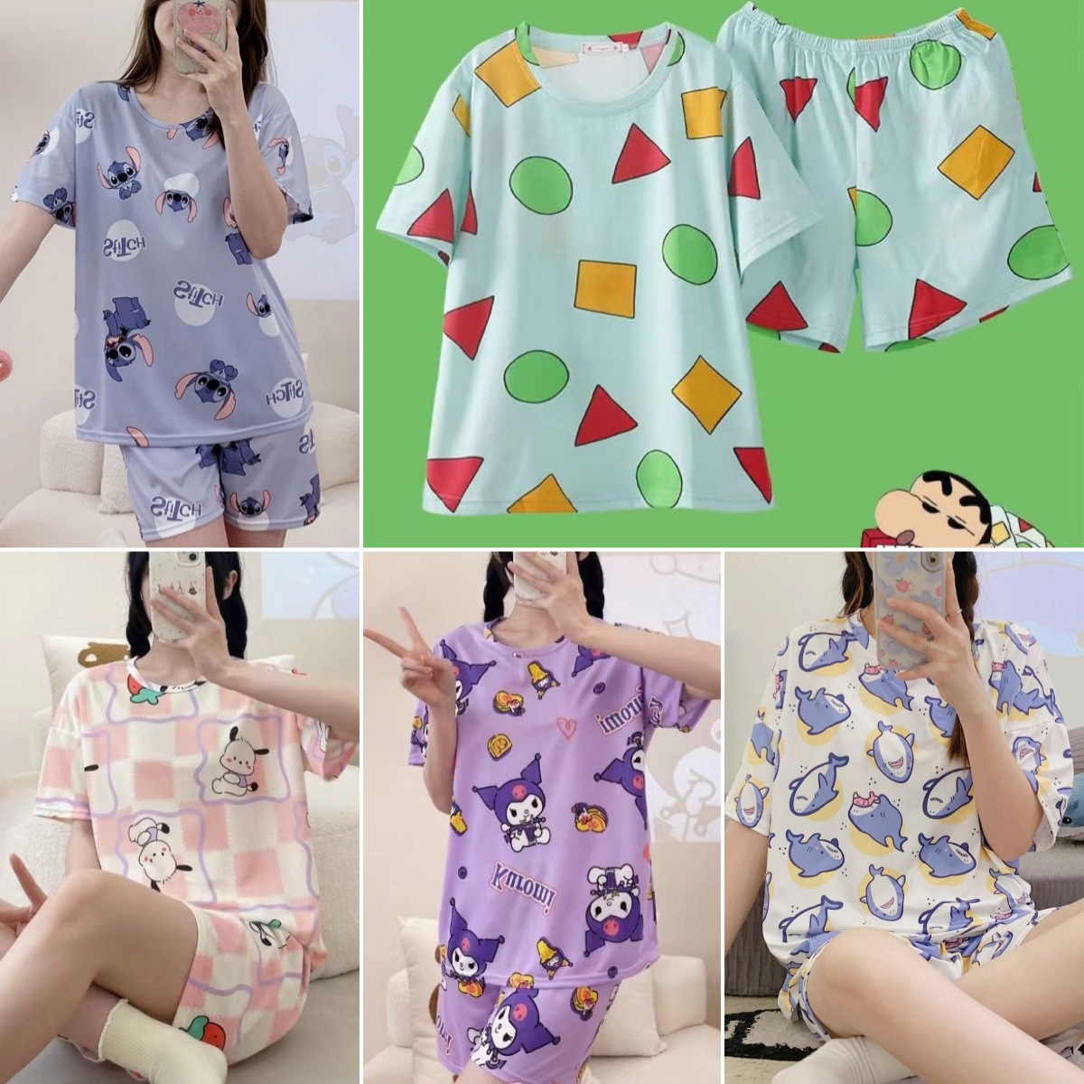 クレヨンしんちゃんパジャマ大きな幾何学的なラウンドネックスーツインターネット有名人かわいい男性と女性同じスタイルイン漫画学生ホーム服