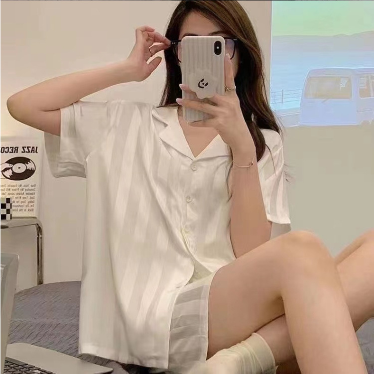 アイスシルクパジャマ女性のストライプ新しい夏薄い半袖夏模擬シルクホーム服 2 点セット卸売可能