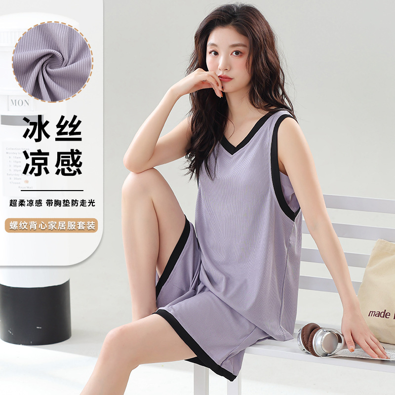 女性用の胸パッド付きプラスサイズのパジャマ、夏用の薄いモーダルアイスシルクベスト、サスペンダーショーツ、ホーム服