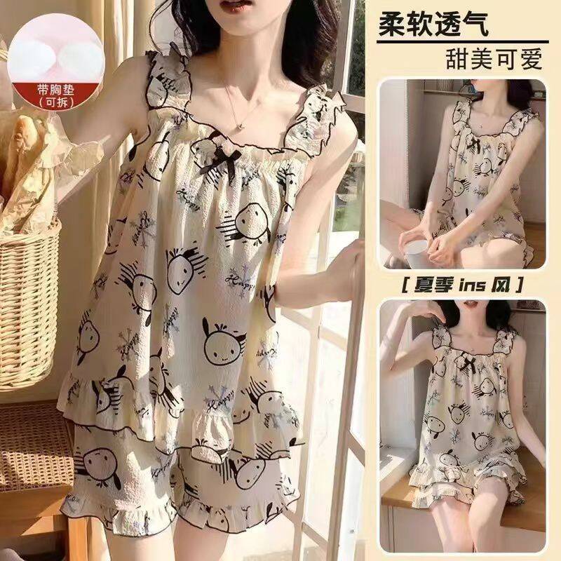2025年新作夏用胸パッド付き女性用パジャマ、甘いサスペンダースーツ、女性は家着として着用できます