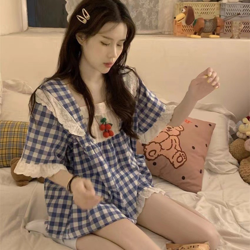 女性のための甘い小さなチェリーチェック柄パジャマのコレクション 2026 新しい夏半袖フリルホーム服 2 枚