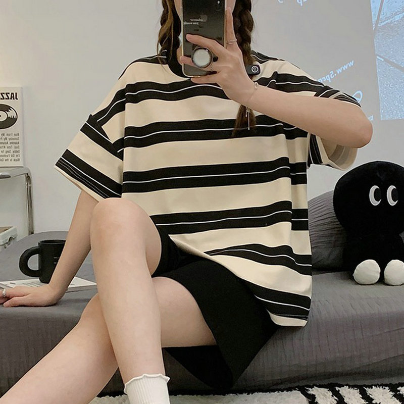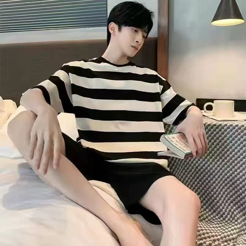 新しい夏のラウンドネック半袖ショーツストライプ韓国漫画メンズプラスサイズセット模造綿ホーム服は屋外で着用できます