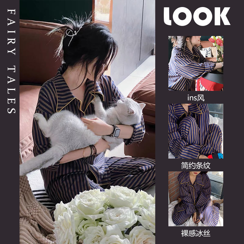 女性のためのインスタイル模造綿ストライプパジャマのコレクション 2023 春と秋の新しい長袖薄いスタイルは家の服の外で着用できます