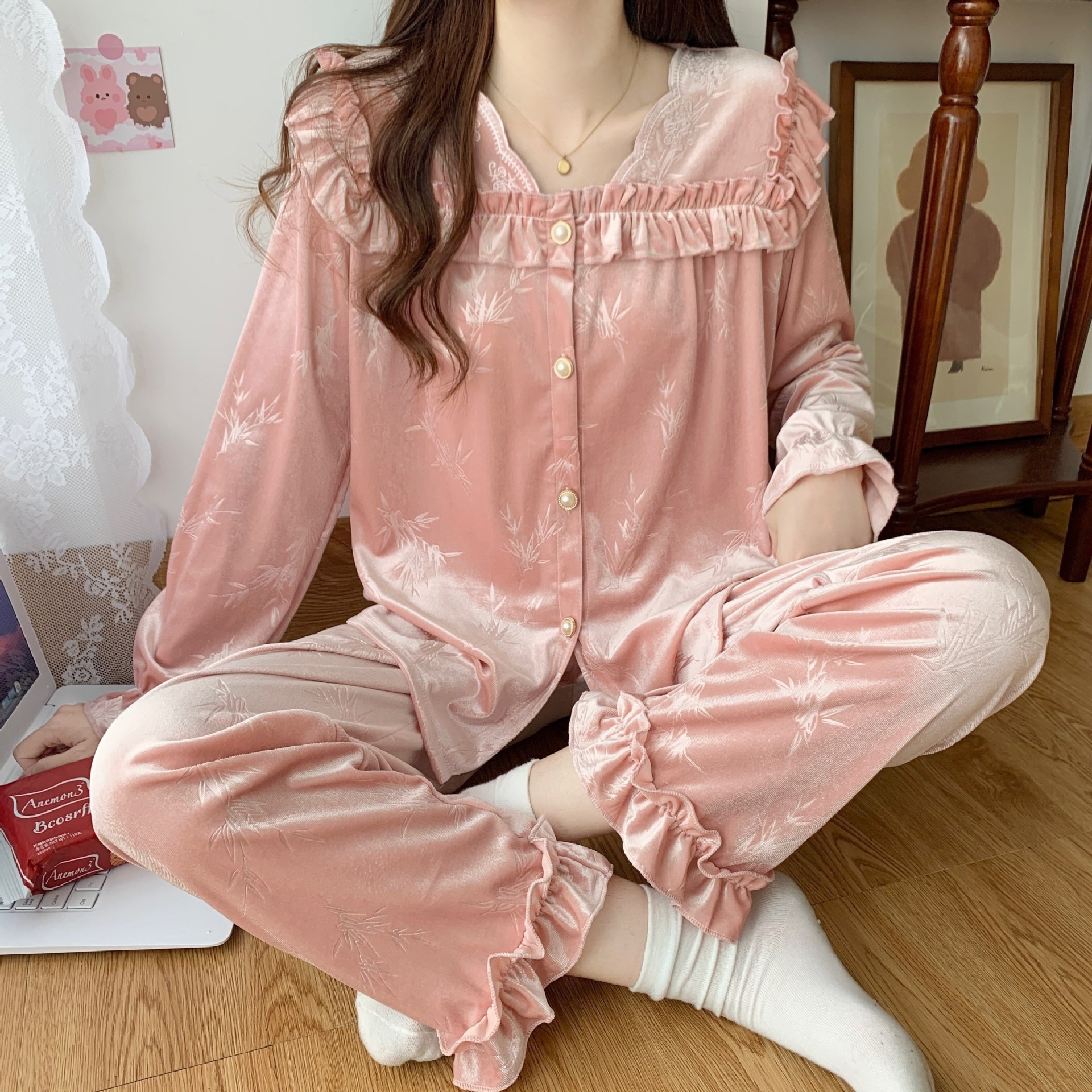 韓国風ゴールドベルベットパジャマのコレクション、女性用インスタイルパジャマ、秋冬ダイヤモンドベルベットネットセレブツーピースホーム服