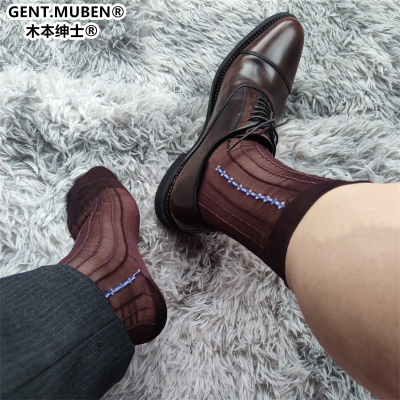 木本紳士銀線幅条青男性正装ビジネススーツ中長筒日系ナイロン正装ストッキング