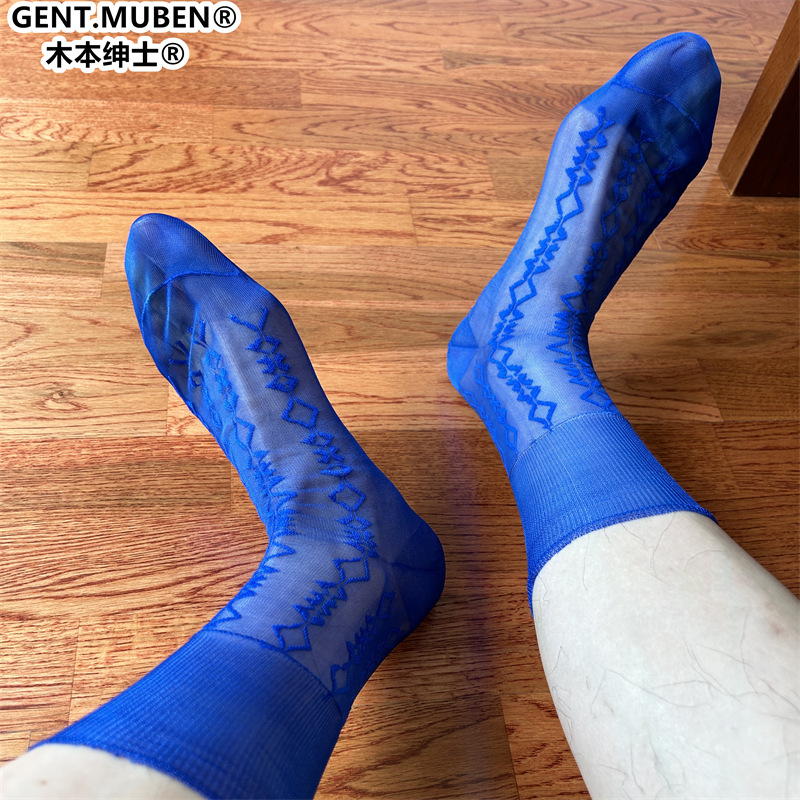 Muben Gentleman LJ03 シングルソールフルナイロンルーズエッジ非カーリング菱形ジャカードサファイアブルーメンズ軽量通気性ストッキング