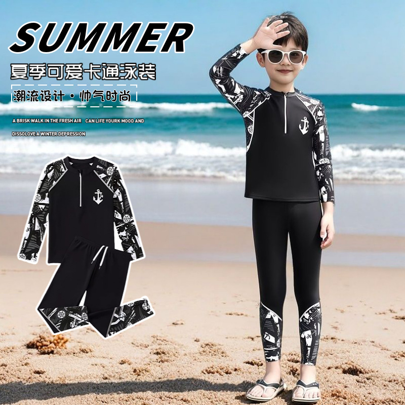 子供の水着の男の子の中で大きい子供の男の子の分体の日焼け止めの長袖のズボンの水着の2025新型の水泳のズボンの装備