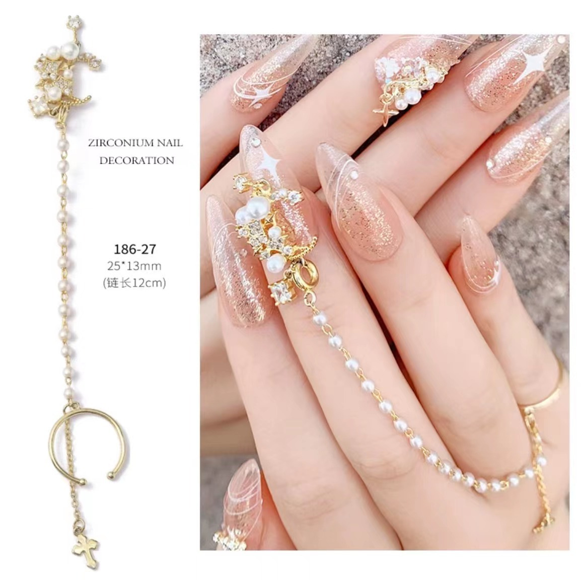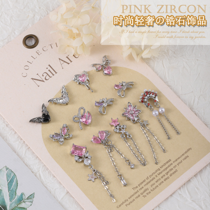 ネット赤爆金ネイルアクセサリー超キラキラピンクジルコン軽贅沢蝶ネクタイペンダント愛チェーン爪装飾品