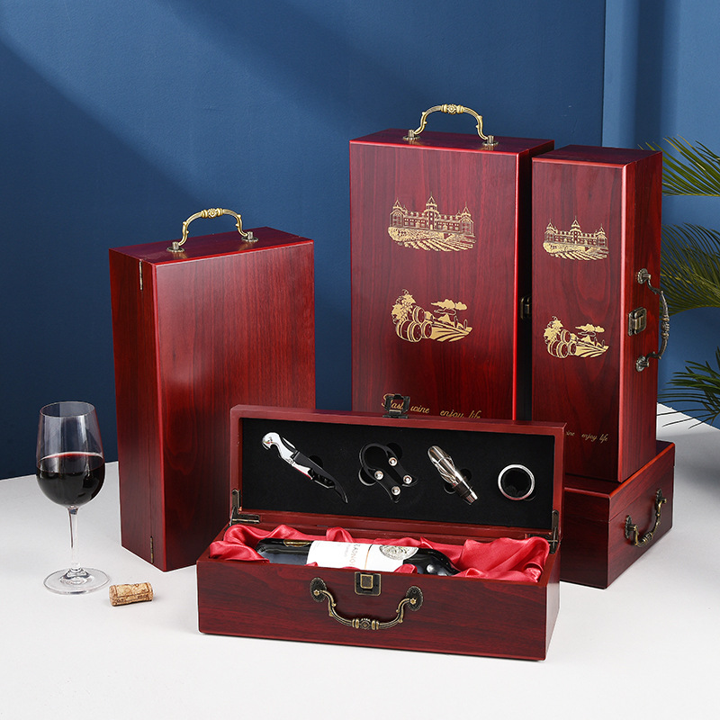 赤ワイン包装木箱 模造紫檀 二本入りギフトボックス シングルハンドル塗装箱 ワインギフトボックス 酒箱 ギフト