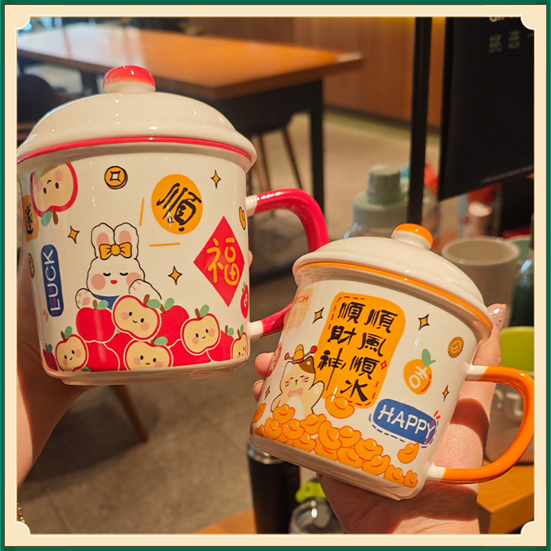 富を手に入れるセラミックマグ蓋付き家庭用模造エナメル大容量朝食カップオフィス飲料水ティージャー