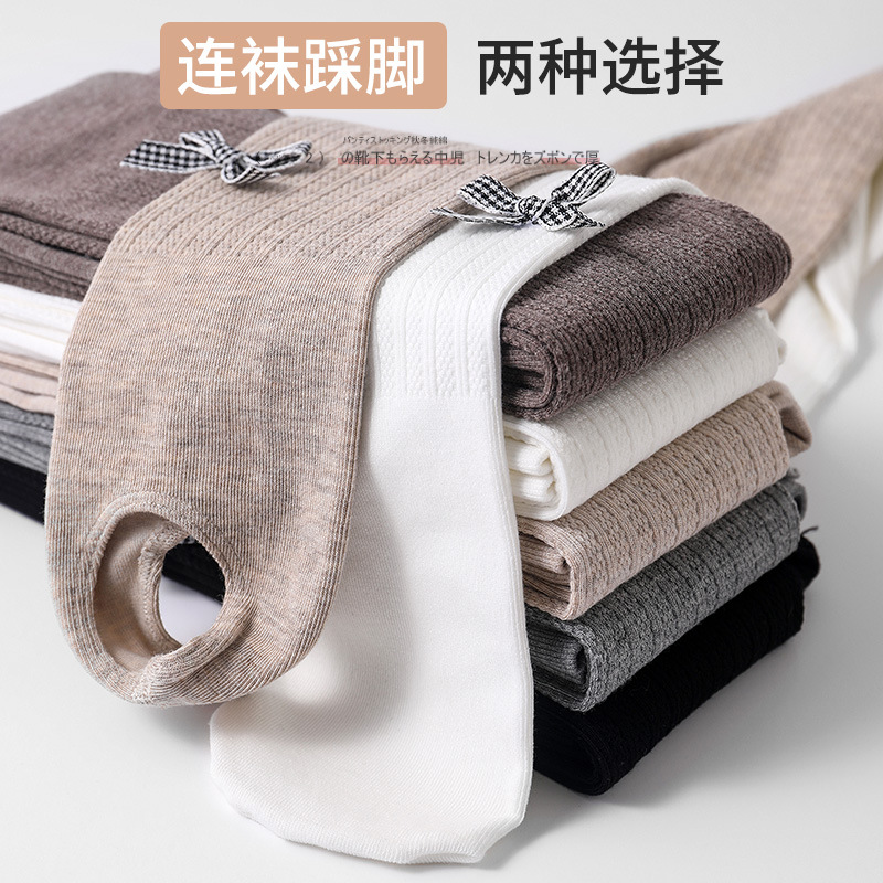 卸売りの新型の女の子の春と秋の薄いタイプのレギンスの靴下の外は縦縞の蝶結びの子供の綿の連体のズボンの靴下を着ます。