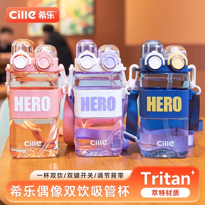 希楽プラスチックカップ子供用ダブルドリンクストローカップ男女高颜値携帯角型カップ大容量tritanカップ