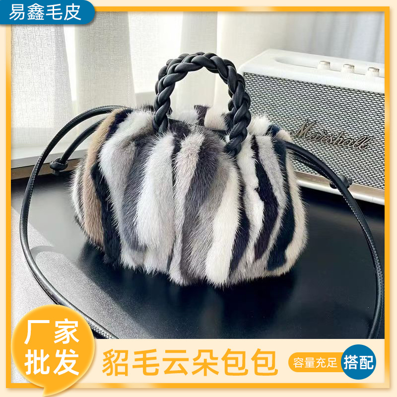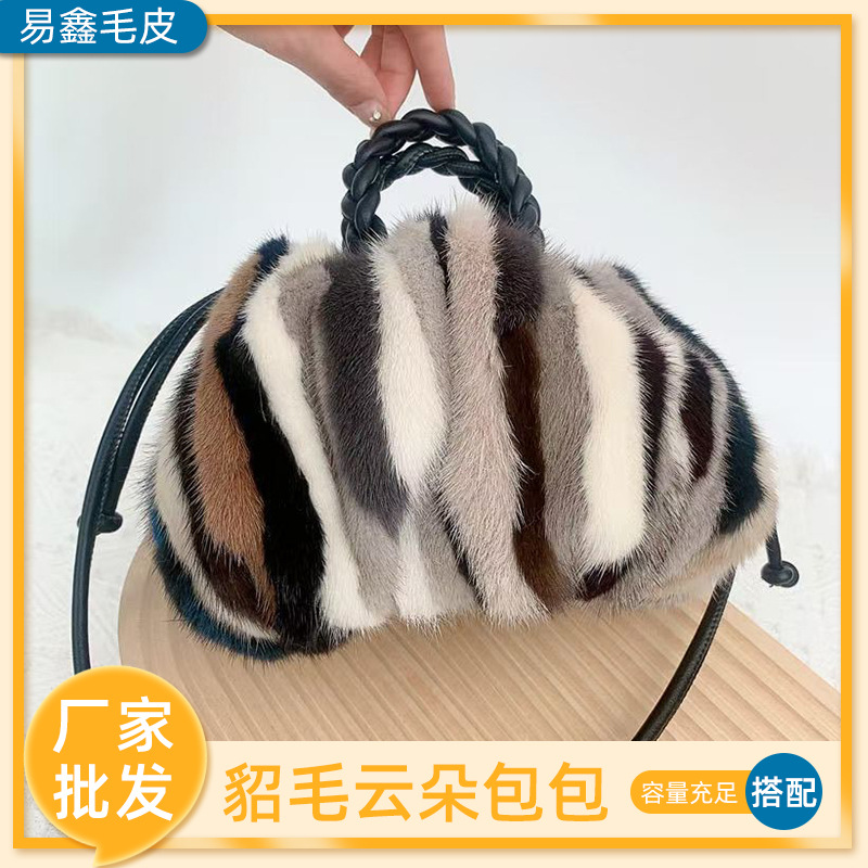 リアルミンクファークラウドハンドバッグクロスボディバッグインターネットセレブ気質ヒョウ柄カラーブロック巾着リアルファーバッグカラフルなクラウドバッグ