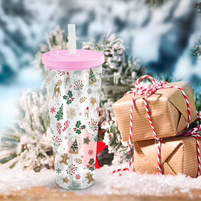 24オンスクリスマス新型プラスチックカップ雪玉カップ蓋漏れ防止ミルクカップストローカップ二重卸売り