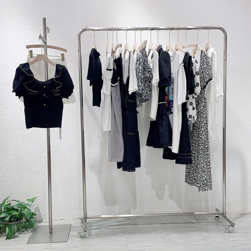 洋服店展示棚床置き式洋服棚ステンレス銀色上壁ハンガー婦人服店棚陳列棚