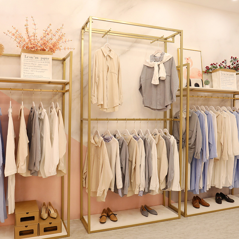 洋服店展示棚床置き式女装板付き服棚シンプル鉄芸中島金色陳列ハンガー